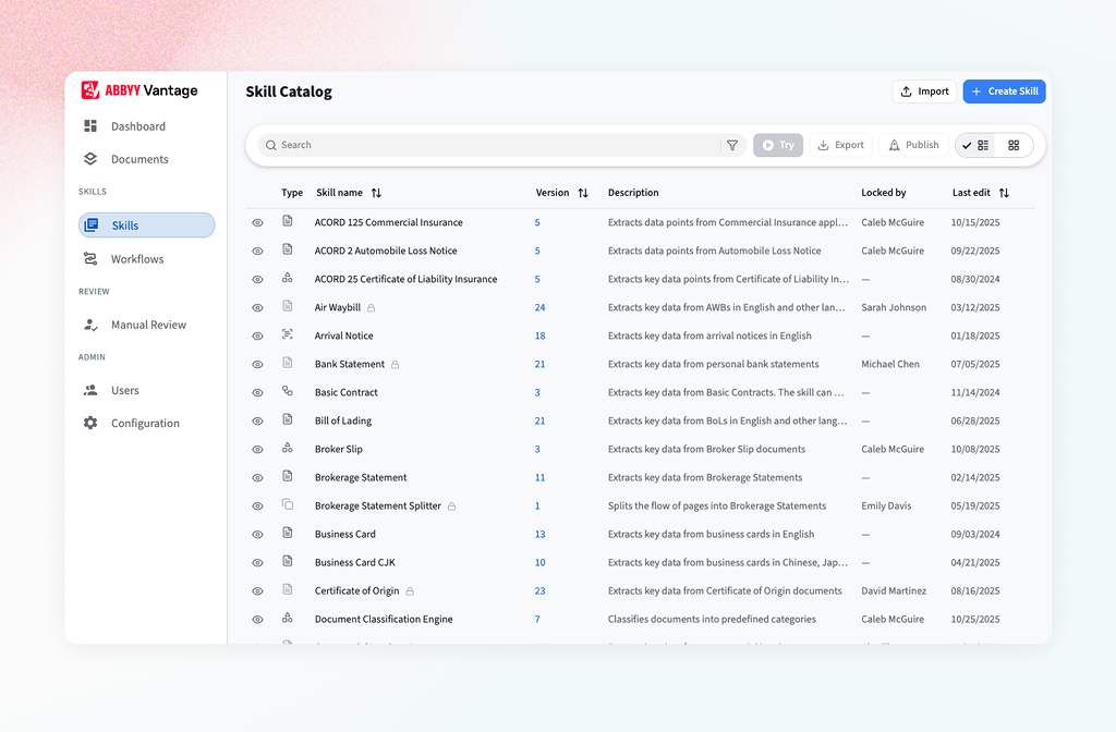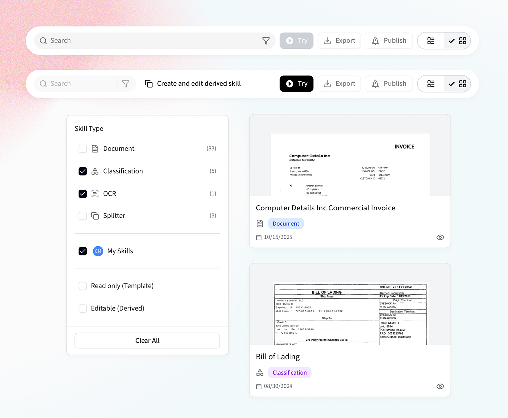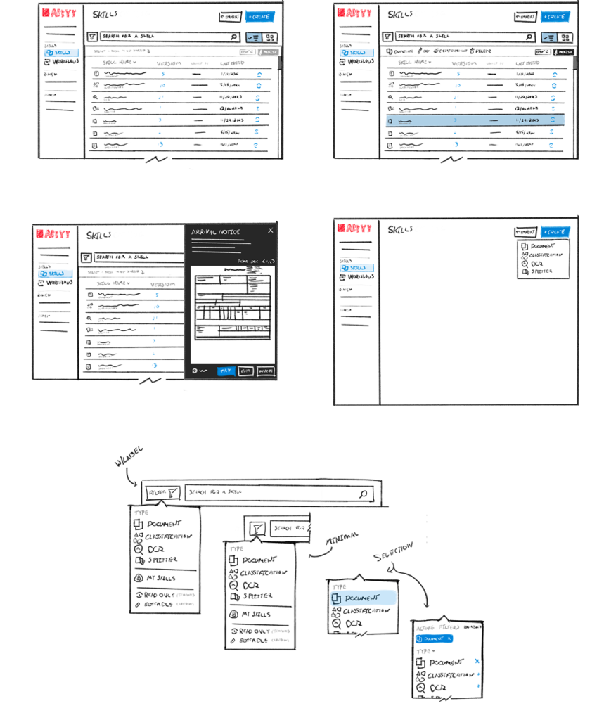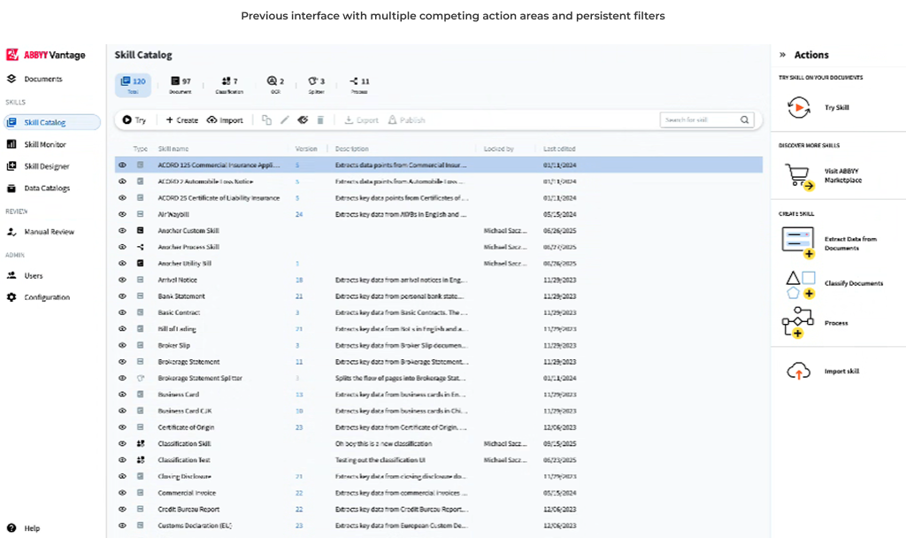 ABBYY’s Skill Catalog, a centralized library of reusable document extraction configurations, was the starting point for many document workflows. Service users relied on it to manage and configure extraction logic, but struggled to navigate, search, and quickly identify what was relevant to their tasks. I audited the existing experience, spoke with users, and designed focused usability improvements within the existing structure.